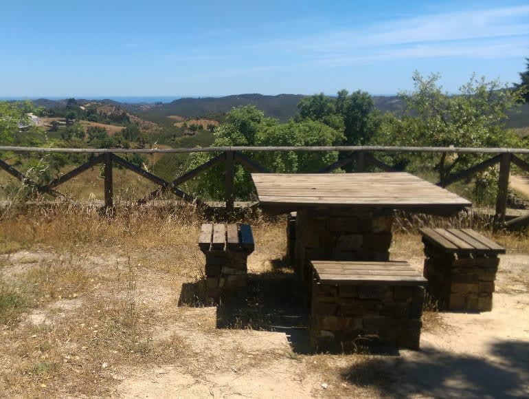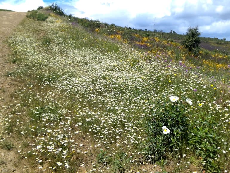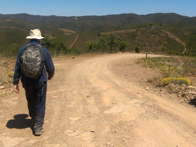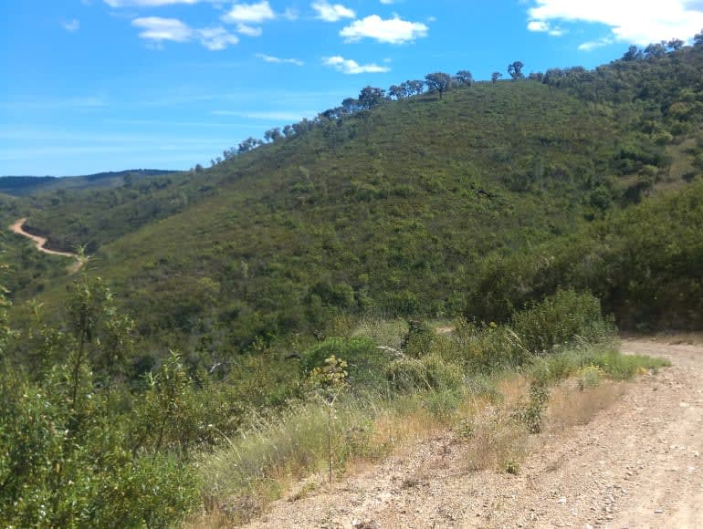 Nous traversons les montagnes de Caldeirão, une région qui relie l’Algarve à la région de l’Alentejo. Malgré son altitude modeste (point culminant à 589 m), elle offre un paysage très particulier, où les élévations arrondies sont traversées par un réseau fluvial dense, principalement constitué de cours d’eau temporaires.